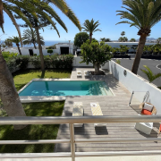 Diese luxuriöse Villa verfügt über 5 Schlafzimmer auf zwei Wohnebenen (auf Anfrage auch getrennt buchbar) und einen tropischen Garten mit privatem Pool. Auf der großen überdachten Terrasse im Erdgeschoss haben 10-12 Personen an einem großen Esstisch Platz. Auf der Sonnenterasse mit Meerblick im ersten Obergeschoss befinden sich ein weiterer großer Esstisch und einladende Sonnenliegen. Die Dachterrasse bietet einen atemberaubenden 380 Grad Blick auf den Teide und auf das Meer. Trotz der zentralen Lage bietet die Villa ein Höchstmaß an Privatsphäre, da sie in einer geschlossenen, parkähnlichen Community liegt. Hier hören Sie inmitten tropischer Vegetation nur das Zwitschern der wilden Sittiche und je nach Windrichtung das Rauschen des Meers, tagsüber zuweilen allerdings unterbrochen durch Flugverkehr aufgrund der Nähe zum Flughafen Teneriffa Süd.